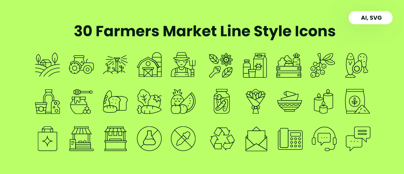 The Farmers Market Layout Pack includes 30 custom-designed icons perfect for agricultural, organic food, and local market websites. The download package contains all source files, giving you full freedom to edit colors, adjust shapes, and customize each icon to fit your brand. Every icon is delivered as a fully scalable vector, so no quality is lost—no matter the size.